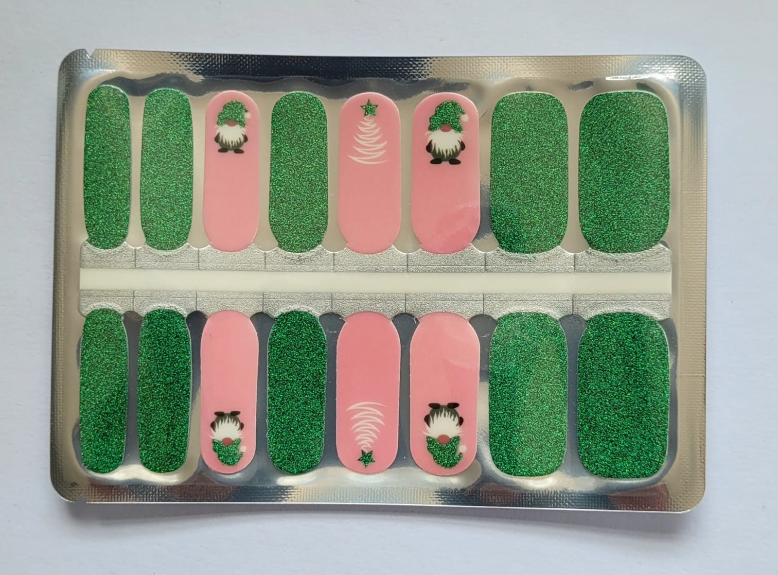Este set de 16 piezas de esmalte seco presenta un diseño navideño en un elegante tono verde con brillos y motivos alusivos a la temporada. Perfecto para quienes desean expresar su espíritu festivo a través de una manicura detallada y sofisticada, este conjunto combina estilo y celebración en cada uña.
