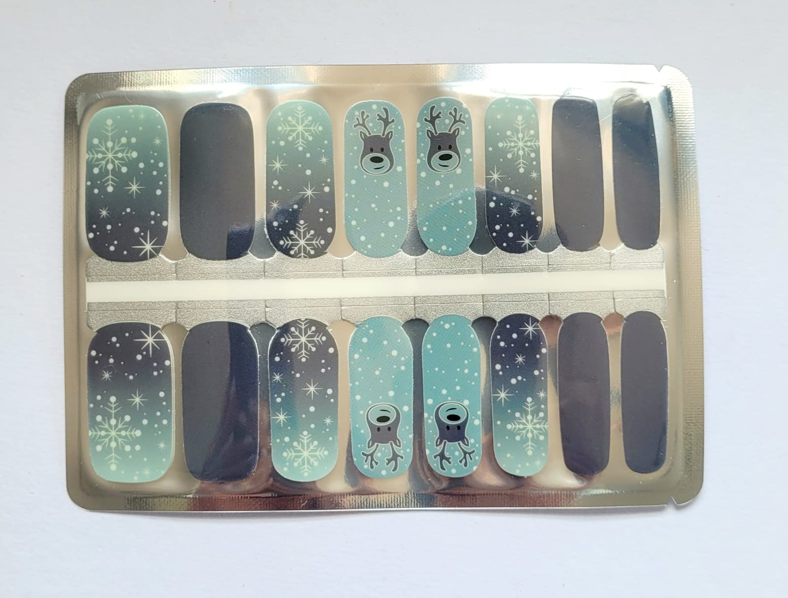 Este set de 16 esmaltes secos presenta un diseño exclusivo navideño en tonalidades azules, con delicados motivos de copos de nieve y alces. Perfecto para darle a tu manicura un toque festivo y sofisticado, ideal para celebrar la temporada con estilo y originalidad.
