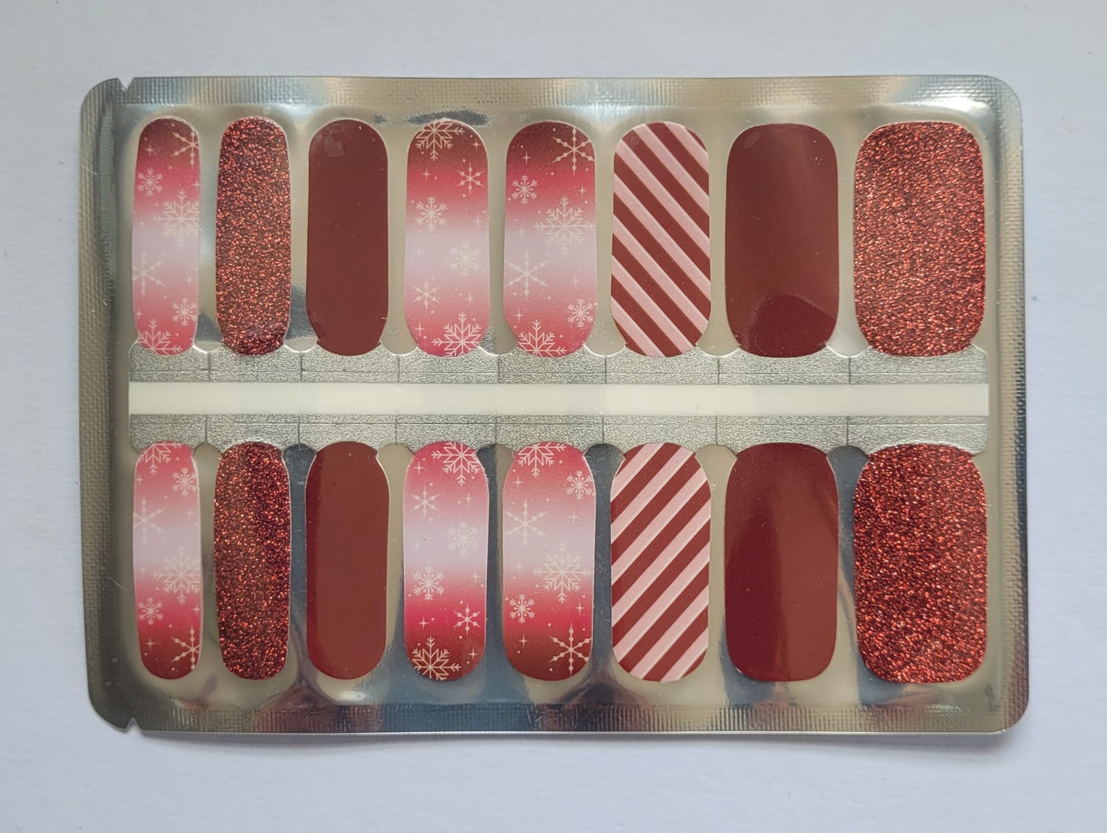 Este set de 16 piezas de esmalte seco presenta colores rojo y rosado con detalles brillantes y diseños navideños clásicos. Perfecto para lograr una manicura festiva y elegante que resalta el espíritu de la temporada de manera sofisticada y duradera. Ideal para quienes buscan un acabado profesional y estilizado en sus uñas durante las celebraciones.