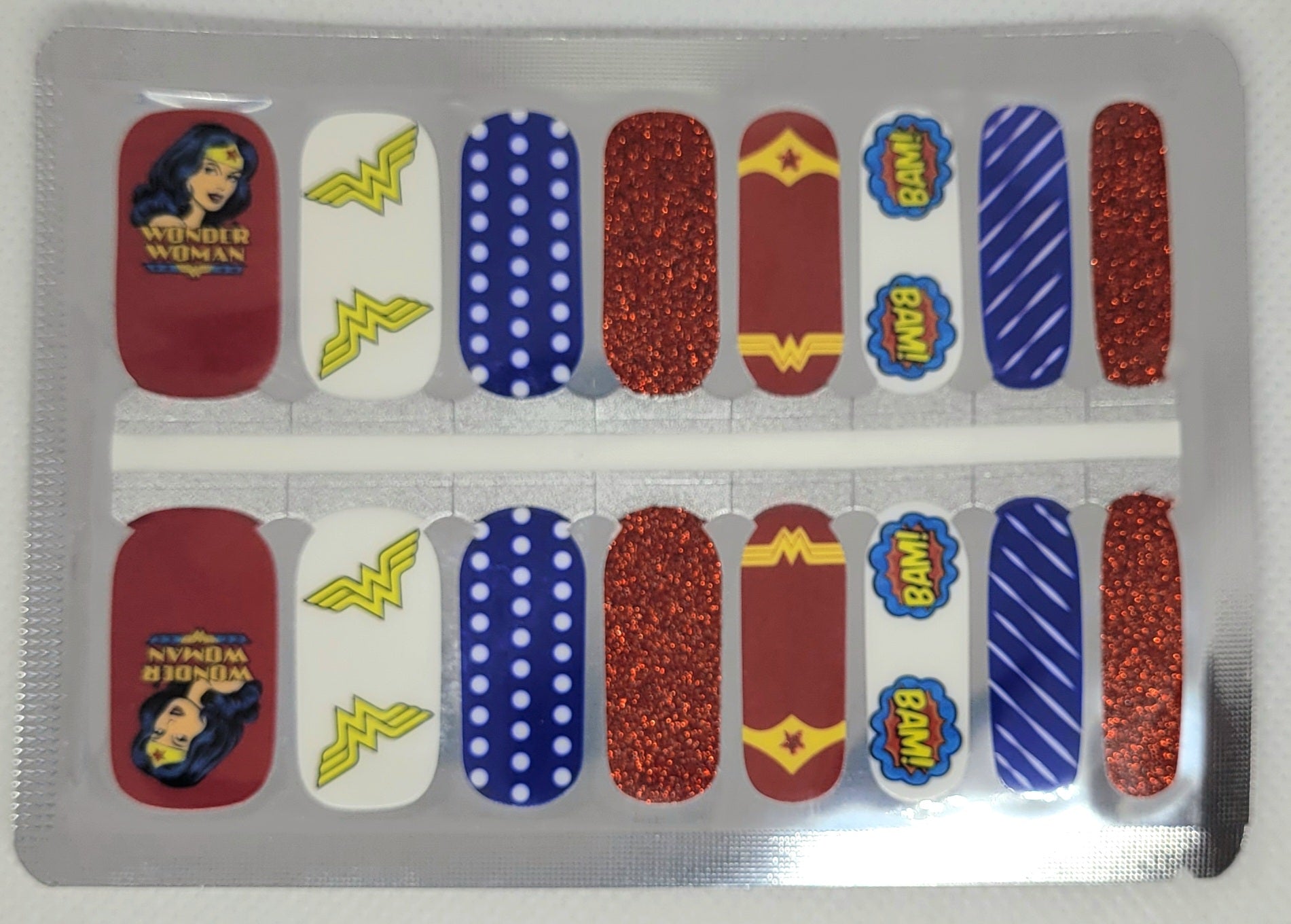 Esmalte se con 16 piezas color rojo con brillos azul y blanco con diseño de la mujer maravilla