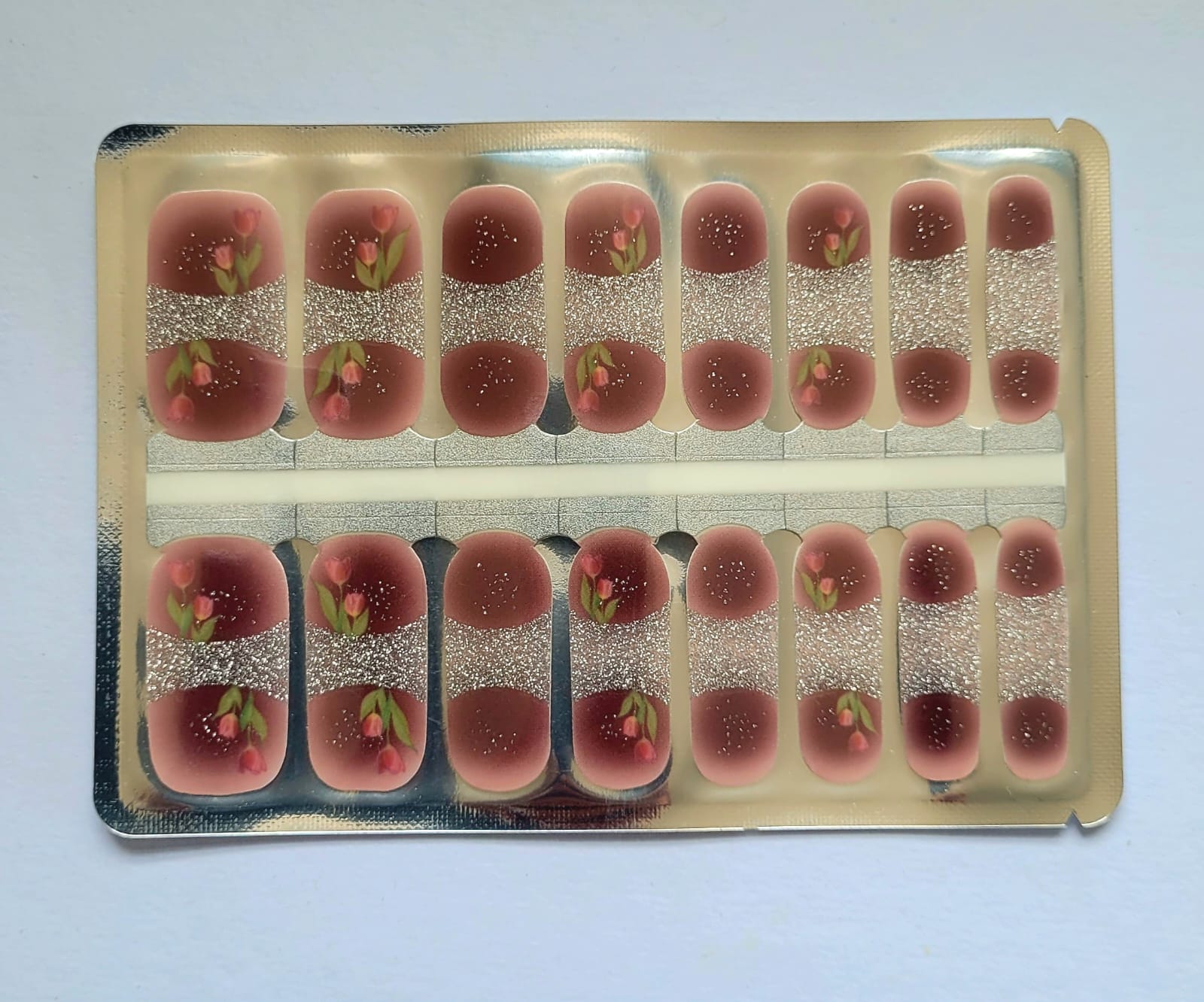 Este set de 16 piezas de esmalte seco ofrece un ajuste perfecto a diferentes anchos de uñas, facilitando una aplicación precisa y cómoda. Con un elegante diseño estilo francés en tono plateado decorado con delicados tulipanes, brinda un acabado sofisticado y refinado. Ideal para quienes buscan una manera rápida y accesible de lucir uñas impecables y con estilo, combinando belleza y practicidad en una sola presentación.